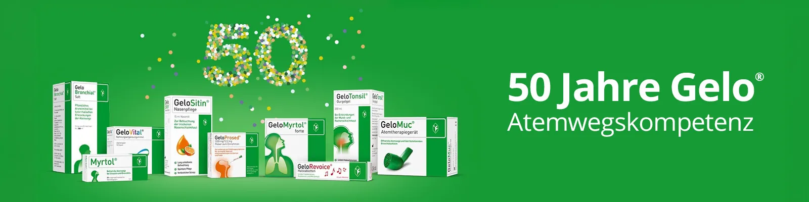 Bei akuten Atemwegsinfekten spielt eine gezielte Behandlung eine wichtige Rolle. Das Gelo® Sortiment bietet bewährte Präparate mit nachgewiesener Wirksamkeit zur Unterstützung bei akuten Beschwerden der Atemwege. Ob Husten, Schnupfen, Halsschmerzen oder weitere erkältungstypische Symptome, die Produkte können dabei helfen, Beschwerden spürbar zu lindern.